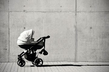 Cartoon baby stroller. Baby toddlers pushchair carriage, kids safety transport for outdoor walking isolated flat vector illustration. Baby wheeled pramsuit on white