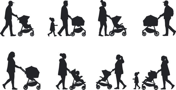 Silhouettes of Adults with Strollers and Children Walking Together in Urban Outdoor Settings, Parenting and Family Lifestyle Vector Illustration