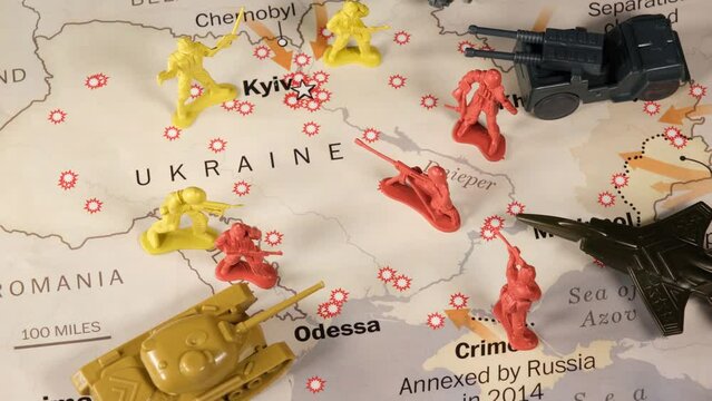 Flag of Ukraine painted on a concrete wall with soldiers. Relationship between Ukraine and Russia