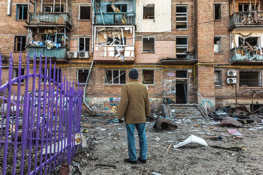 Damaged residential buildings in the aftermath of  shelling in Kyiv