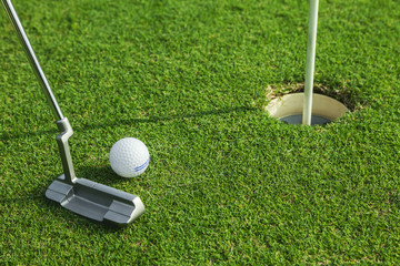 Golf clubs and golf balls on a green lawn in a beautiful golf course with morning sunshine.