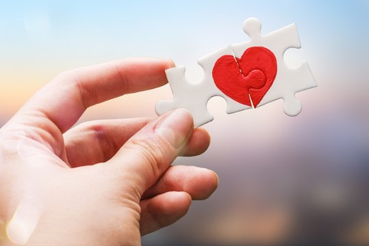Incomplete heart composed of puzzle pieces with one missing piece symbolizing cardiology awareness and the concept of incomplete health and medical treatment