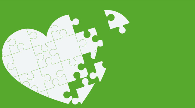 Top view white heart puzzle with a missing piece over background. Health care green. heart green puzzle pieces design background