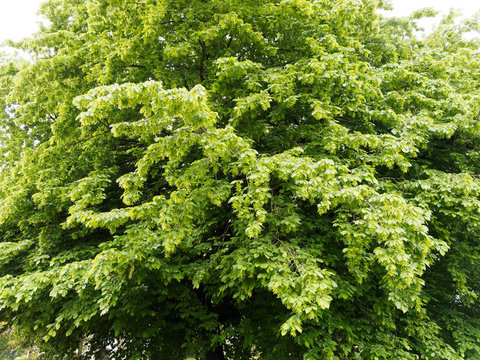 Carpinus betulus | Houppier pyramidal du charme commun au feuillage dense et vert avec des akènes et samares pendant sous les feuilles oblongues et dentées vert franc