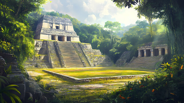 Ancient mesoamerican ball court surrounded by lush jungle foliage and majestic pyramidal structures in the archaeological site of palenque, chiapas, mexico. Mayan Ball Court. Illustration