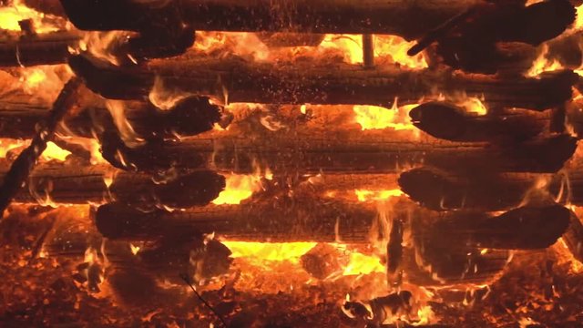 Bonfire pyre burning at night, bright orange flames of fire, 4K