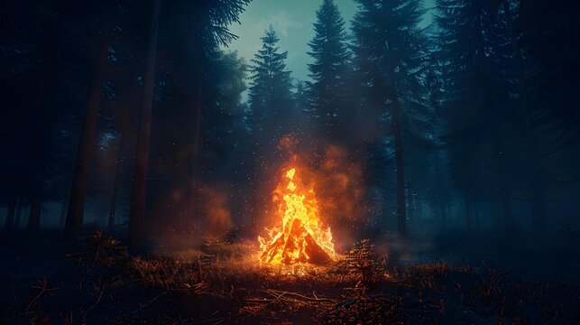 Mystical scene of burning pyre in nighttime forest