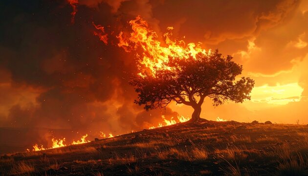 Dramatic image of a burning tree in a fiery landscape under an ominous sky