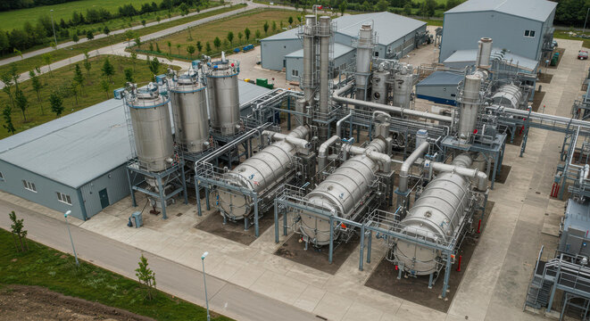 Modern biochar production facility with stainless steel pyrolysis chambers. Industrial plant for renewable energy. Eco-friendly approach to waste management with carbon capture technology