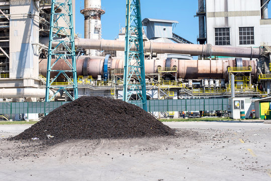 Huge pile of shredded tires used as alternative fuel in rotary kiln in cement plant