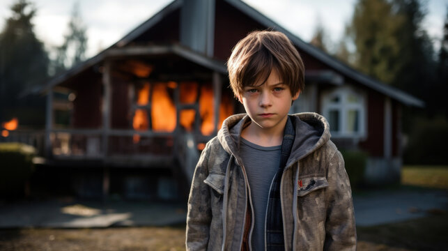 Boy pyromaniac looking to the fire match. Concept of pyromania
