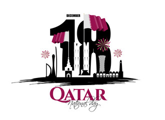 Qatar National Day of Qatar. a national holiday celebrating the union and gaining independence Qatar December 18, 1878. silhouettes sights of Qatar capital of Doha vector holiday illustration.