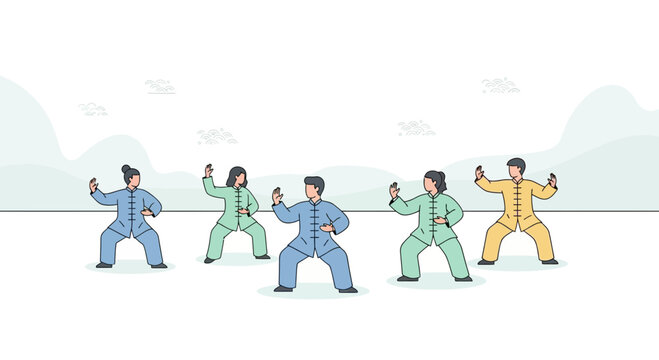 Group Practicing Traditional Tai Chi Forms in Harmony with Nature Illustration