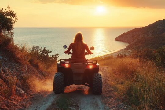Happy male driver in protective helmet enjoying extreme ride on atv quad motorbike in autumn mountains at sunset.