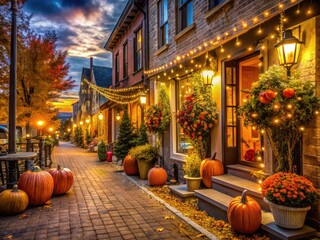 Spooky seasonal decorations adorn storefronts and streets of a quaint small town on Halloween night, illuminated by jack-o-lanterns and twinkling string lights.