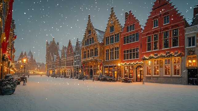 Small town main street shopfront view decorated for Christmas holiday season. American flags visible on display. Quaint stores with light on windows. Classic street view with architecture and lights.
