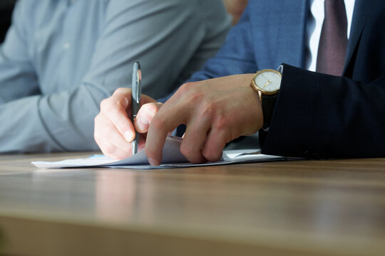 Man is concentrating on signing a document during a business meeting or negotiation. Signing an order, transaction, memorandum, agreement or contract. Photo. No face. Selective focus