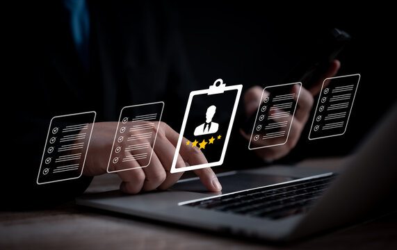 Employee performance evaluation and rating system concept. Businessman selects candidate profile with five-star rating on digital interface to assess qualifications and recruitment criteria.