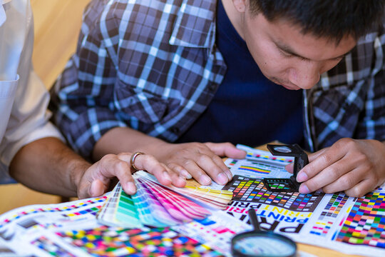 Team graphic designer checking print quality of media graphics proof print and color guides in printing industry. Selected focus