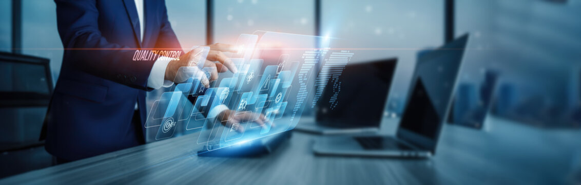 Quality control. Hand touching quality assurance platforms, monitoring connection on virtual screen testing inspection compliance defect detection automation process improvement performance standards.