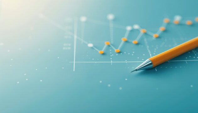 Close-up of a pencil on a graph with declining data points, symbolizing business analysis, statistics, and financial trends.