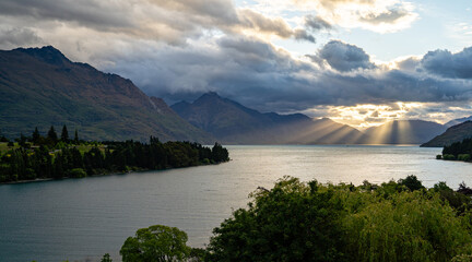Queenstown Panorama at golden hour, New Zealand, South Island. View from Queenstown Skyline, main attraction in the alpine city.