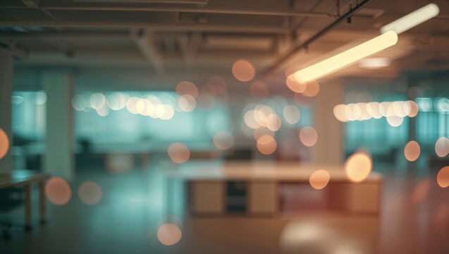 Modern office with soft lighting creating a warm atmosphere during a quiet workday in the urban environment