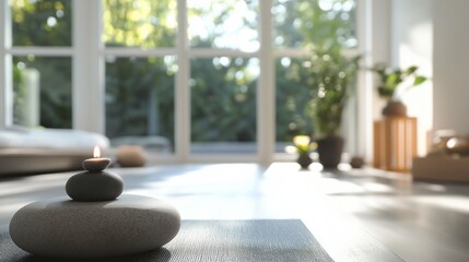 A serene spa setting designed for ultimate relaxation and rejuvenation. Soft candlelight flickers gently over smooth stones, fresh flowers, and aromatic oils