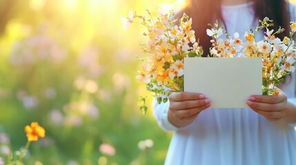 Quinceanera girl presents beautifully designed invitation card surrounded by colorful flowers in a serene outdoor atmosphere
