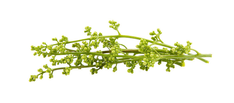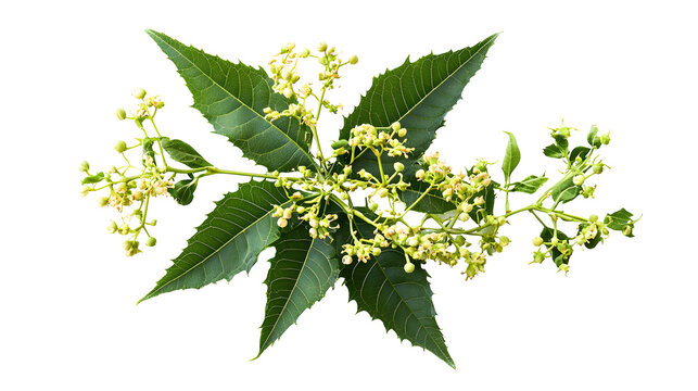 Herb neem leaves and fresh neem flowers isolated on white background.