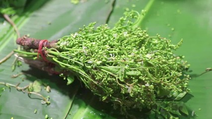 Shop selling fresh green beautiful herb flower buds of Neem, Nim, Margosa, Quinine, at Night fruit market Lamphun Thailand.