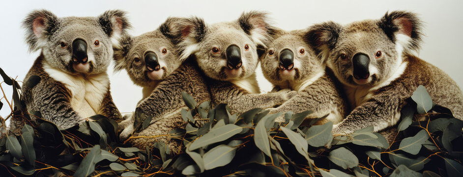 A quintet of koalas leans into one another amidst lush eucalyptus leaves, evoking tranquility and a sense of home, suitable for animal and nature lovers.