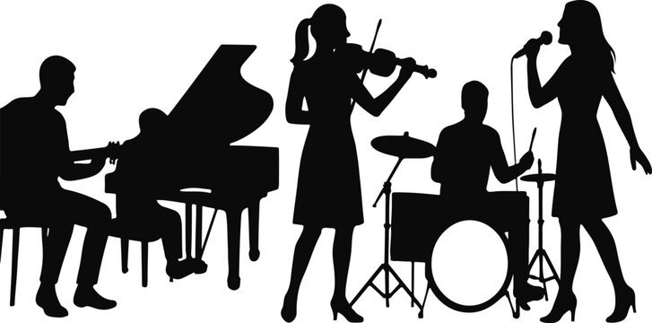 Silhouette of a diverse musical ensemble featuring a guitarist pianist violinist drummer and vocalist performing live music against a white background