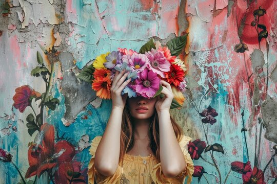 A woman in a yellow dress stands against a brightly painted wall, her face hidden by a crown of colorful flowers, Celebrate the quirks and imperfections that make us unique