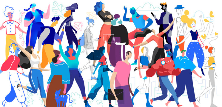 Folla di personaggi disegnati in vari stili