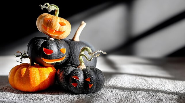 Carved pumpkins are stacked. Black, orange color with scary faces. Celebration