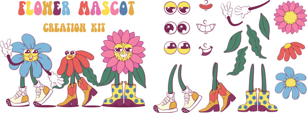 Mascot characters set vector in retro 30s cartoon style. Cute, funny faces, as examples of 50s, 60s old animation style.