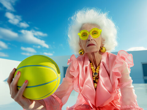 An elderly woman in a pink ruffled outfit and yellow glasses holding a neon green basketball under a bright sky. A quirky and colorful portrayal of senior fashion with a playful twist.