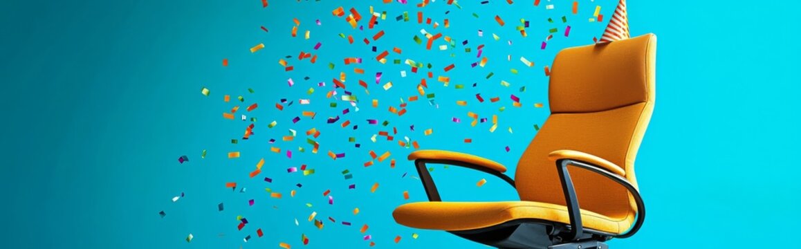 A serious office chair wearing a tiny party hat, confetti falling around it