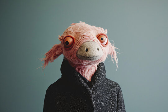 Pink creature with big eyes in black sweater