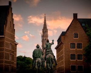 statue of Don Quixote looking at the city hall of Brussels.