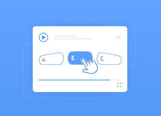 Interactive Video Quizzes concept. Add interactions on video clips - quizzes pop up, elaborating text and links. Vector isolated illustration on blue background with icons