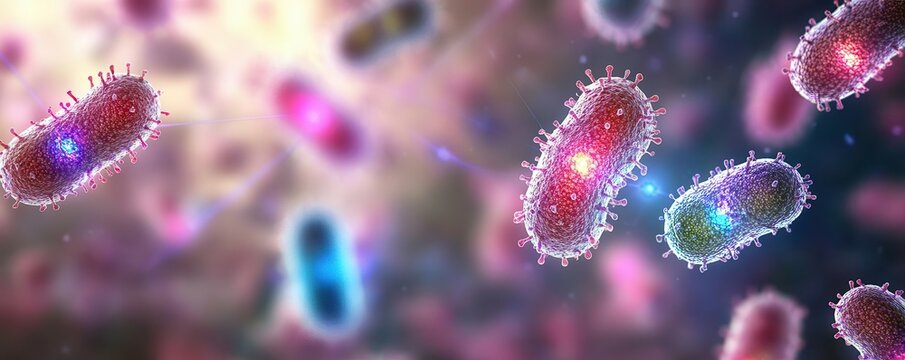 Artistic depiction of bacteria engaging in quorum sensing with vibrant colors and abstract shapes