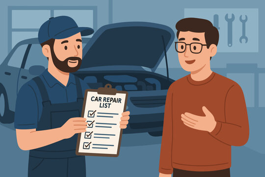 Car mechanic in overalls presents repair checklist to customer in auto service garage. Technician explaining vehicle maintenance, diagnostics, and repair quote to client. Auto workshop scene.