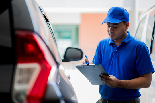 Mechanic show the car checking list for customer with blur his assistant checking red car. Focus on mechanic and customer on the right side. Auto car repair service center.