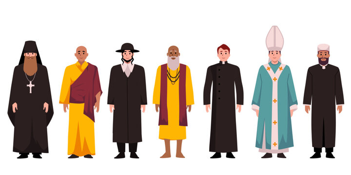 Catholic Pope, Buddhist and Hinduism monks, Christian Orthodox, rabbi Judaist, Muslim mullah religion priests vector set