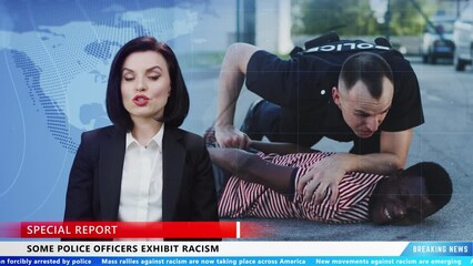 Female news anchor in TV studio reporting breaking news about racism and commenting racist attitude of the police officers
