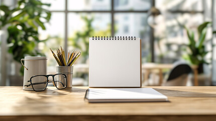 Mockup calendar on the table. Blank spiral desk calendar. Empty 3D table calendar