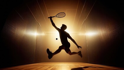 A racquetball player diving for a shot, silhouette, action photography, aesthetics,