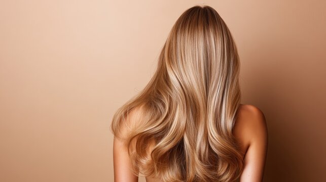 This stunning image showcases long, flowing hair cascading down the back, emphasizing elegance and natural beauty against a warm, minimalistic background.
